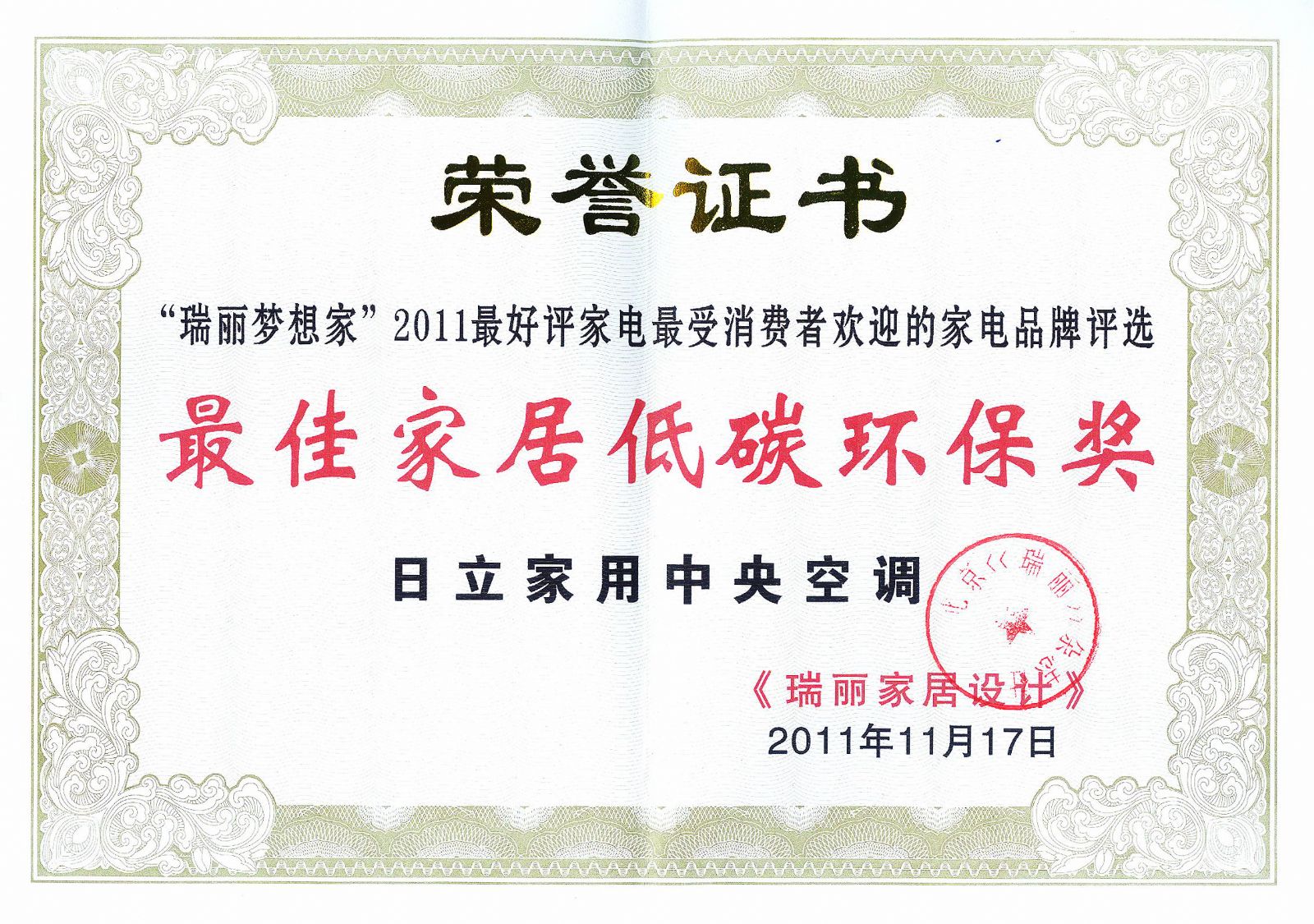 日立獨(dú)家榮膺“瑞麗夢想家”家用中央空調(diào)大獎
