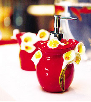 制造陶瓷一向是中國人的拿手技術(shù),這個(gè)乳液瓶和牙刷架采用了整體燒制的手法,花朵造型逼真,再搭配接近透明的材質(zhì),賦予衛(wèi)浴一種別樣的美感。需要注意的是,陶瓷類產(chǎn)品屬于易碎品,在使用時(shí)要非常小心,防止割傷或劃傷皮膚。