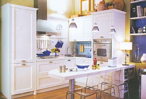 白漆櫥柜令小廚房充滿了明亮印象,人造石臺面與櫥柜渾然一體,品質(zhì)感絲毫不減。在與壁柜相接的空白墻面上,天藍色玻璃馬賽克令流動的視覺產(chǎn)生出美妙的變化。所有的餐廚用具都以藍色、白色和金屬色為主,統(tǒng)一的色彩使小廚房里沒有任何的雜亂。