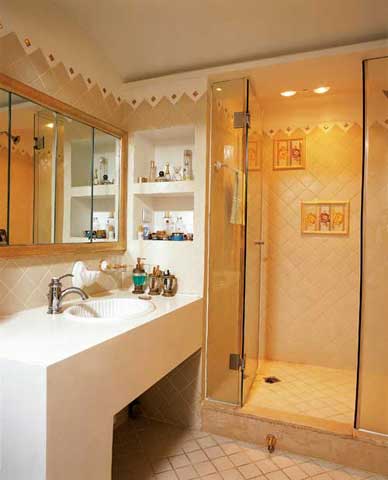 最值得玩味的是,各種花朵元素被精心安排在各處,巧妙地呼應(yīng)著居室的主題。同樣的藍(lán)色壁紙上對比運用了田園風(fēng)格的枝葉繁茂的大團(tuán)花與清新簡潔的小碎花;白色的書柜特意選擇了無背板的設(shè)計,可以透露出壁紙的花色,在細(xì)節(jié)的微小之處更體現(xiàn)了空間延伸的概念;鵝黃紗幔上的淡雅提花和白底沙發(fā)上的紅、藍(lán)花朵又與房間主色和諧一致;甚至在浴室的墻面和門上都不忘裝飾上花朵元素;更有花瓶中絢爛的藍(lán)、白花卉點綴其中,營造出猶如夢幻般的私家花園的居室,一切都令人感覺那么愜意、愉悅。